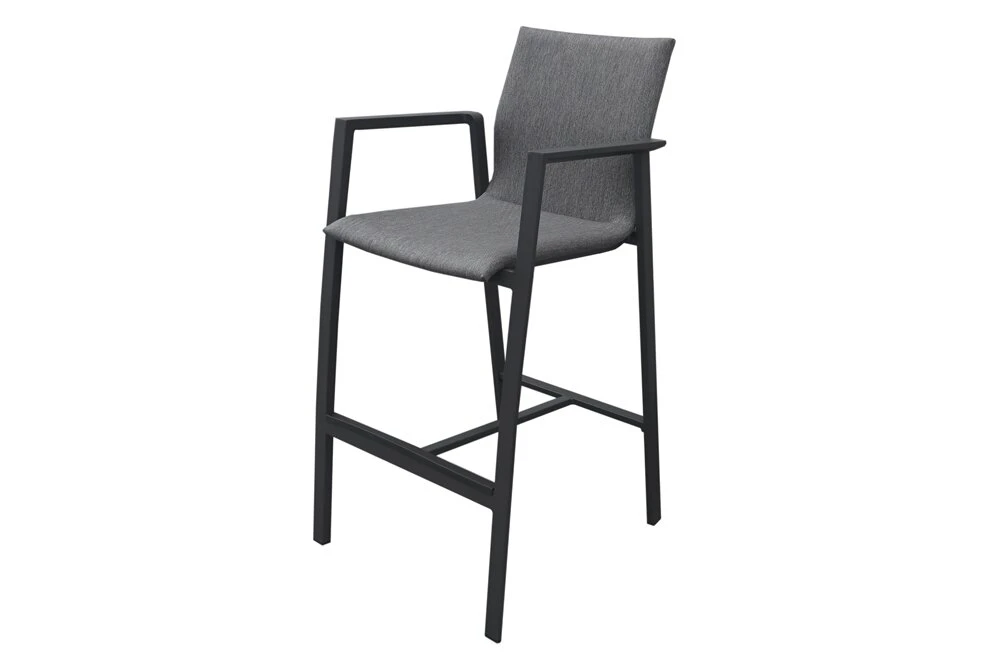 De barstoel, vervaardigd uit hoogwaardig aluminium, straalt robuustheid uit en is bestand tegen verschillende weersomstandigheden. De elegante antraciete kleur voegt een vleugje moderniteit toe aan je buitenruimte. De zitting en rugleuning zijn bekleed met all-weather stof en vulling, wat niet alleen zorgt voor ultiem comfort maar ook betekent dat deze barstoel bestand is tegen allerlei weertypes.